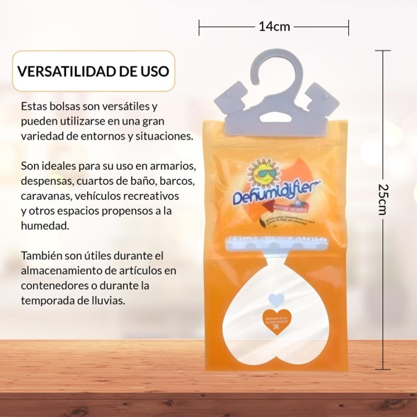 Están especialmente diseñadas para absorber el exceso de humedad del ambiente de forma eficaz y sencilla. Gracias a su potente agente deshumidificador, estas bolsas capturan las partículas de agua suspendidas en el aire, previniendo así problemas comunes como el mal olor a humedad, la aparición de moho y la condensación. Son perfectas para proteger la ropa y los textiles en armarios y vestidores, mantener secos los cajones con documentos importantes, o cuidar tus objetos de valor en zonas propensas a la humedad.